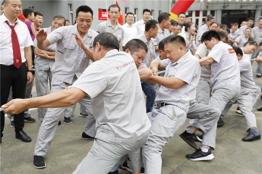拔河比赛现场气氛十分热烈而欢快,队员们个个斗志昂扬,挥汗如雨、奋力拼搏,不到最后一刻不屈服,用汗水讲述团结协作的真谛。现场呐喊声此起彼伏,竞赛场上处处洋溢着激情与活力。